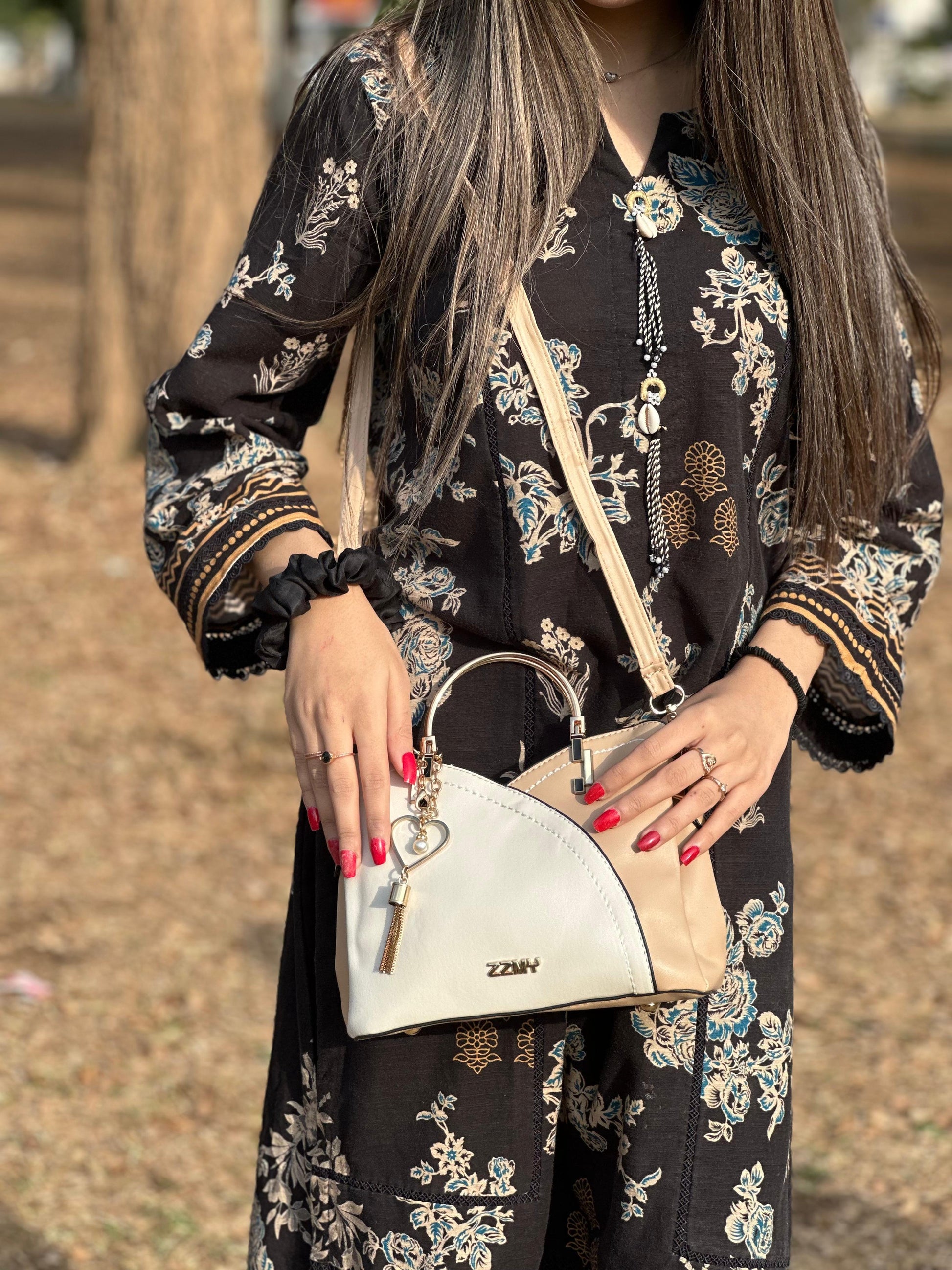 Introducing our Dual Shade Color Contrast Handbag, a striking accessory that perfectly balances modern design with functional versatility. Crafted with precision, this handbag features a unique heart-shaped silhouette enhanced by metal accents and playful tassel decorations, making it an eye-catching addition to any wardrobe. The colorful two-tone design adds a dynamic and fashionable touch, elevating your style for any occasion.